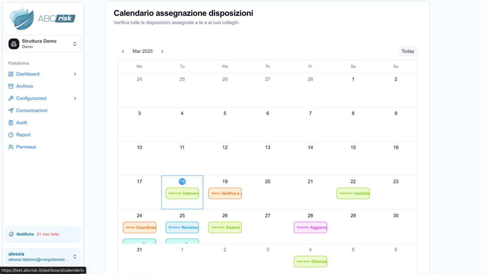 Collegamenti ed assegnazione delle disposizioni con la visualizzazione delle proprie disposizioni a calendario; è possibile agire inserendo la tipologia, cambiando lo status e comunicando con i colleghi coinvolti - Audit