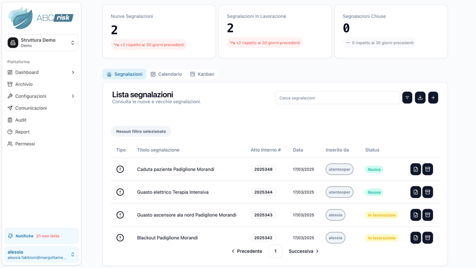 Con l’adozione di ABCrisk, la gestione del rischio clinico diventata digitale, migliorando l’efficienza e la tracciabilità delle informazioni. Assicura una registrazione accurata e tempestiva dei rischi, ottimizzando il monitoraggio continuo e facilitando interventi immediati, la prevenzione degli incidenti e riducendo gli errori umani.